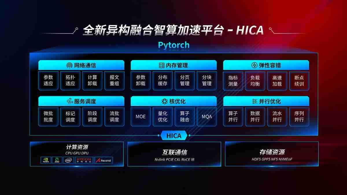 通过自研的服务层、、中间适配层、、以及调度编排算法,,,,采用数据并行、、模型并行等多种并行方式,,把并行计算任务进行有效的分解,,,使其分别由相应的软件栈和算力资源来承接。。。。当GPU资源变化,,,,HICA可以实时动态调度计算子任务并调整模型拓扑和架构,,以充分聚合各种算力资源。。。