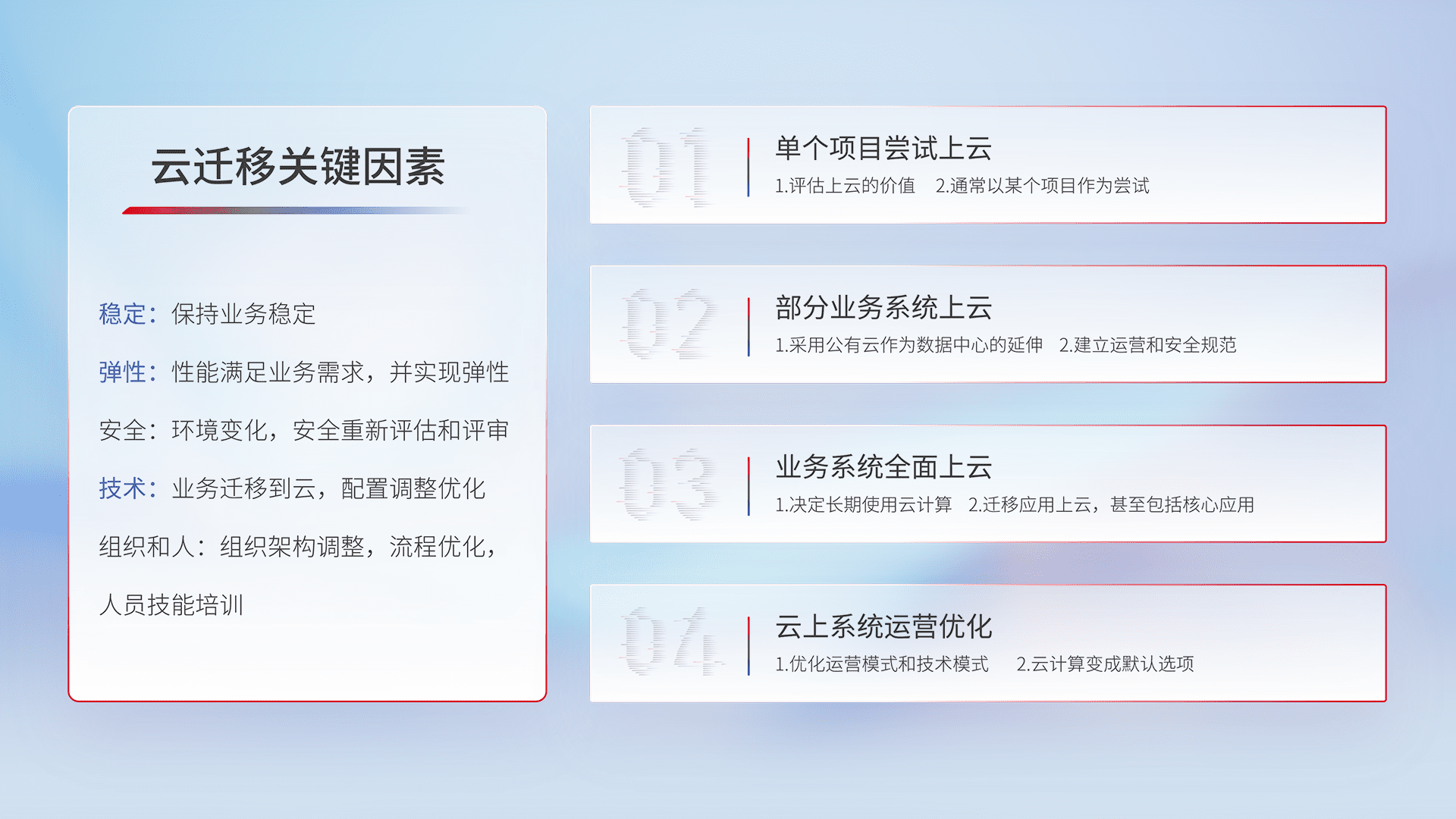 结合实际业务,,,,从规划设计、、、、云平台选型、、、、云原生改造、、、数据迁移、、、集成交付,,,,迁移全过程为客户识别最佳上云路径,,,做好风险识别管理,,设计网络架构、、、、身份权限、、安全审计合规、、操作审计、、、日志审计、、监控告警策略、、、多站点容灾设计等,,,,对云上基础设施进行整体规划,,提升IT治理水平,,,,以满足弹性、、、高可用、、高性能的需求。。。