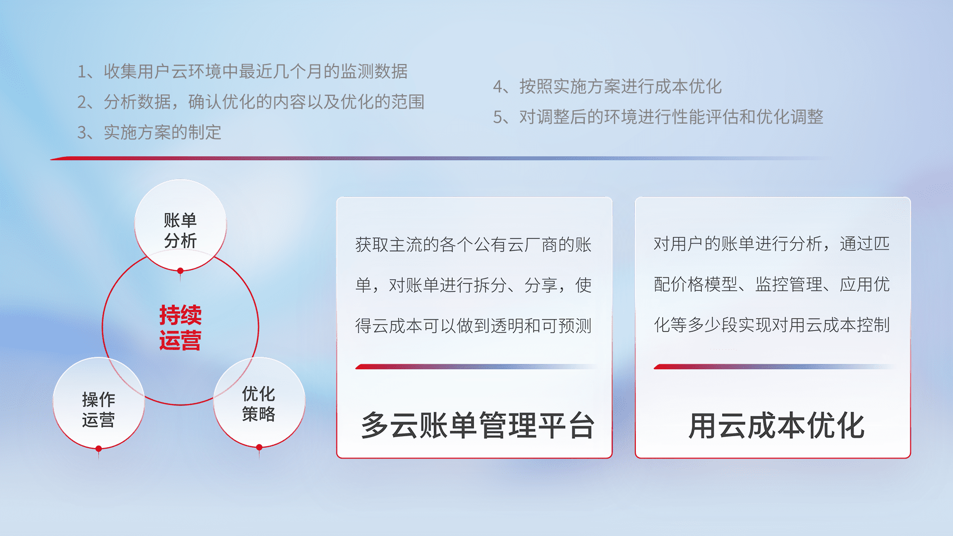 通过多云纳管,,,以统一的资源数据模型把客户的云资源进行抽象和封装,,,,进而实现对多云资源的统一操作,,,保障云资源管理的可靠性、、稳定性与可用性。。。量身定制化运维内容,,,,配置、、、开发运维、、、补丁管理、、、备份、、、监控、、、认证和访问管理、、、、审计和日常巡检等,,,保障在用云过程中的可靠度,,,,稳定度以及高可用率。。。。